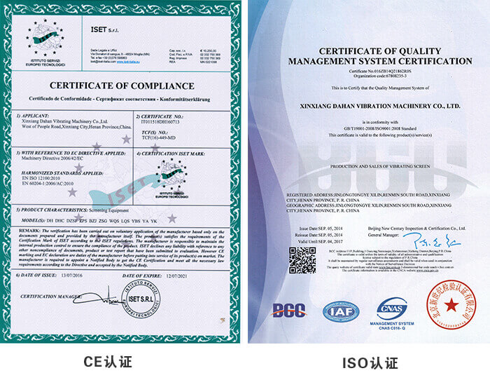 大漢機械生產的全不銹鋼振動篩在選材是上精益求精,精選304與316、316L三種材質三種材質供您選擇,我們保證每次選用的原材料都是進行質量檢測合格之后才加工使用,生產的所有設備都已通過ISO9001國際質量體系認證和歐盟CE認證!質量有保證,您可以放心使用。